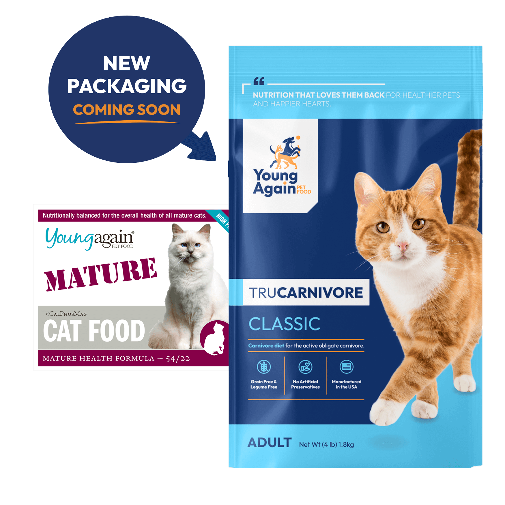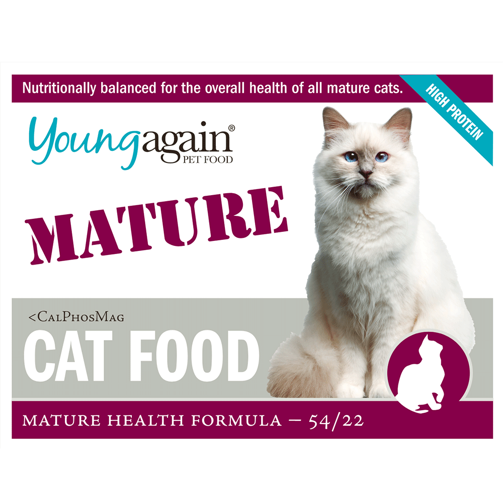 My 17 year old cat had blood work. My vet said he had the blood work of a healthy 4 yr. Old. I guess that's where they get the name "Young Again" . Sammy also had a fatty tumor on his shoulder that has all but disappeared. Oh , I almost forgot he suffered terrible with IBS , loose bowels to the point of him crying.,Since moving to Florida. Back home he could catch rabbis and birds, here there are too many predators so he didn't have access to the outdoors. The high protein in Young Again has cured his loose bowels . Cant thank this company enough! .My four cats are fed zero mature.